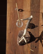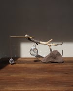 Lo que define esta escultura es su brazo extendido, que sostiene con precisión una barra de latón donde reposan dos atrapaluces de distinto tamaño, en un juego sutil de equilibrio y luz.