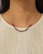 El Collar Ayra es una pieza formada por cuentas cilíndricas de Rodocrosita Rosa combinadas con bolitas de 6mm de Apatito Azul. Una pieza elegante y versátil, ideal para darle un toque moderno y sutil a cualquier look.
