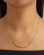 El Collar Boreal está compuesto por una cadena fina que sostiene una pieza trenzada por dos hilos. Su tamaño es de 42cm de largo.