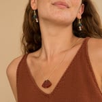 El collar Kleos está formado por una cadena de culebrilla, más gruesa que los otros collares de la colección. Cuelga de el una piedra de Cornalina en forma de abanico. Cada pieza de Cornalina es única e irrepetible.
