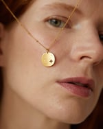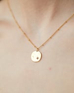 La cadena de bolitas mide 46 cm de largo. La medalla tiene una forma orgánica de 15mm de diámetro.
