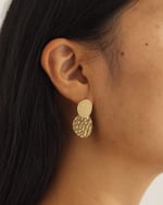 Los Pendientes Eco están formados por un círculo pequeño con una textura granulada o martillada muy fina y otro círculo algo más grande, también con textura martillada, pero con un acabado que genera reflejos más amplios y variados.