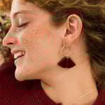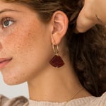 Los pendientes Kleos están formados por un aro fino M de 25 mm de diámetro. Cuelga de ellos una piedra de Cornalina con forma de abanico. Cada pieza de Cornalina es única e irrepetible.