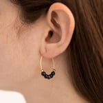 Los pendientes Mythos S están formados por varias bolitas pequeñas de mineral Aventurina de 3 milímetros en un aro muy finito de un diámetro de 25 mm.